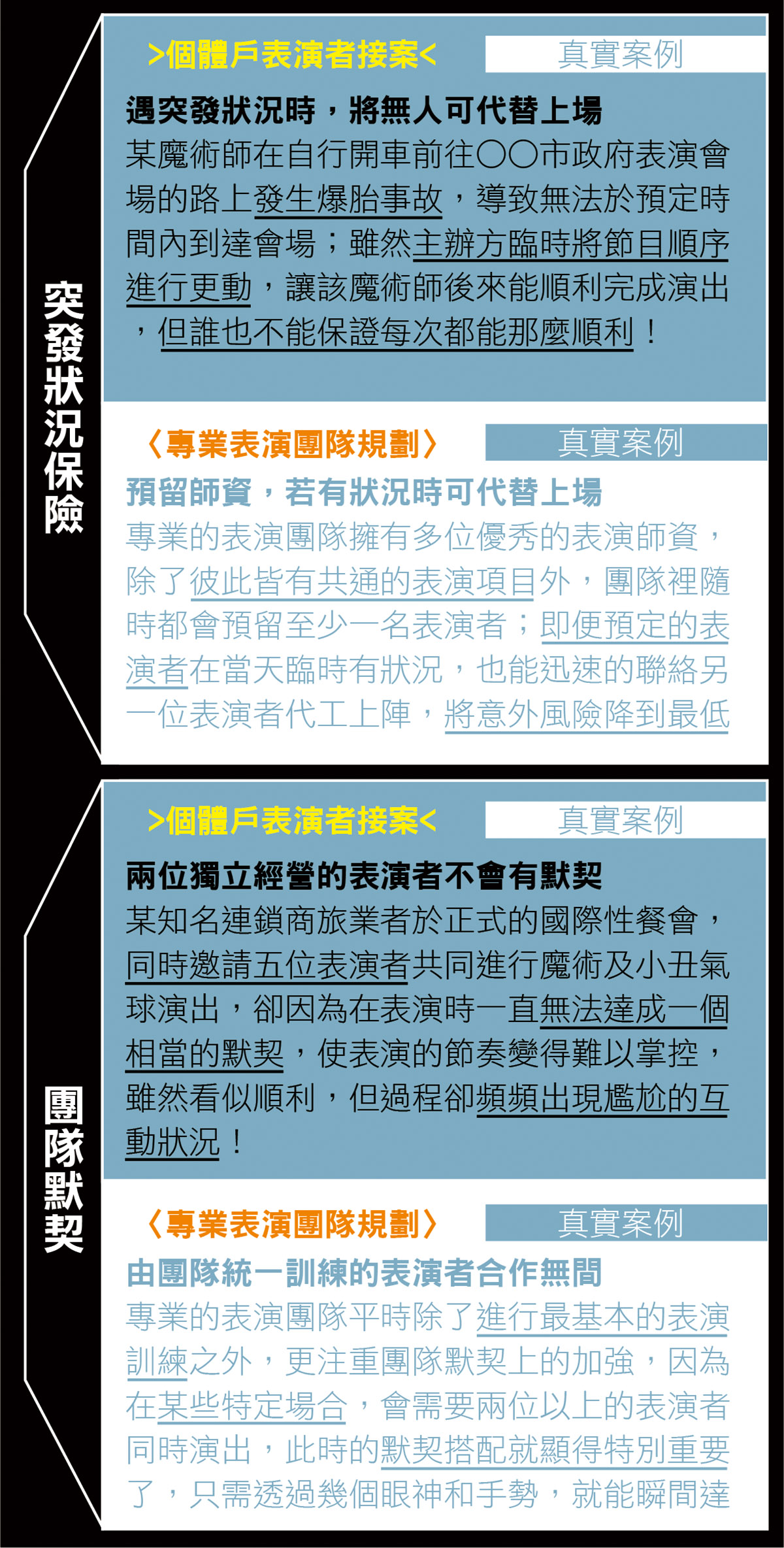 創作藝術與商業性兼具的獨特表演,擅長把客戶要傳遞的理念用魔術方式重新包裝後,運用在各種活動場合,創造出獨一無二並符合主題的魔術行銷。