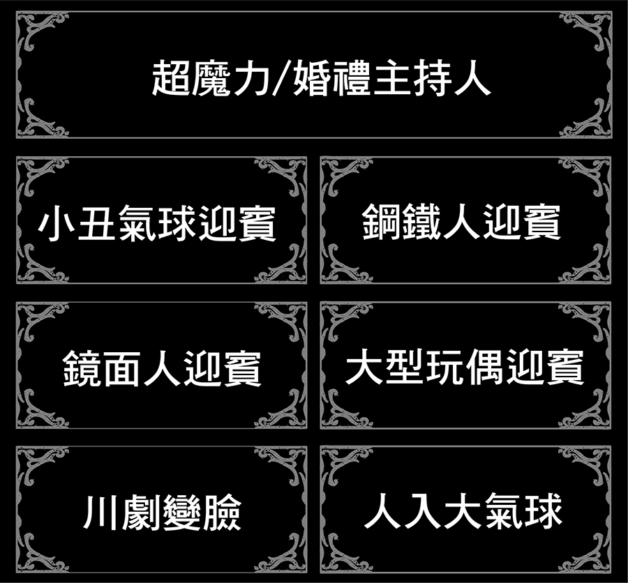 在上菜的空檔、進場前的換裝時間、客人到場時等待婚宴開始的時間,是不是會怕現場歡樂的氣氛突然不見呢?讓無限娛樂婚禮團隊來完成夢想中的婚宴,與您一對一的詳細介紹並且規劃,小從婚禮小物、大到活動流程,以及婚宴上相片區、禮桌、拍照牆、紅毯走道等每一區角落、每一項細節都幫您處理好,讓您有一場夢幻的婚禮回憶。