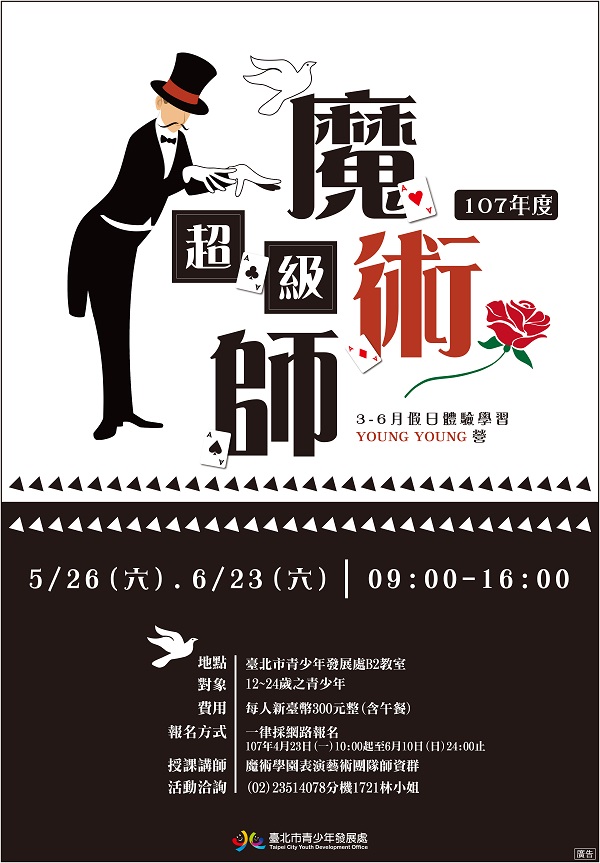 活動目的:透過生動有趣的魔術學習,提升青少年口語表達、肢體語言、臨場反應等能力,同時啟發其創意思考力,藉以增強青少年的自信心,自「滑世代」中解放。