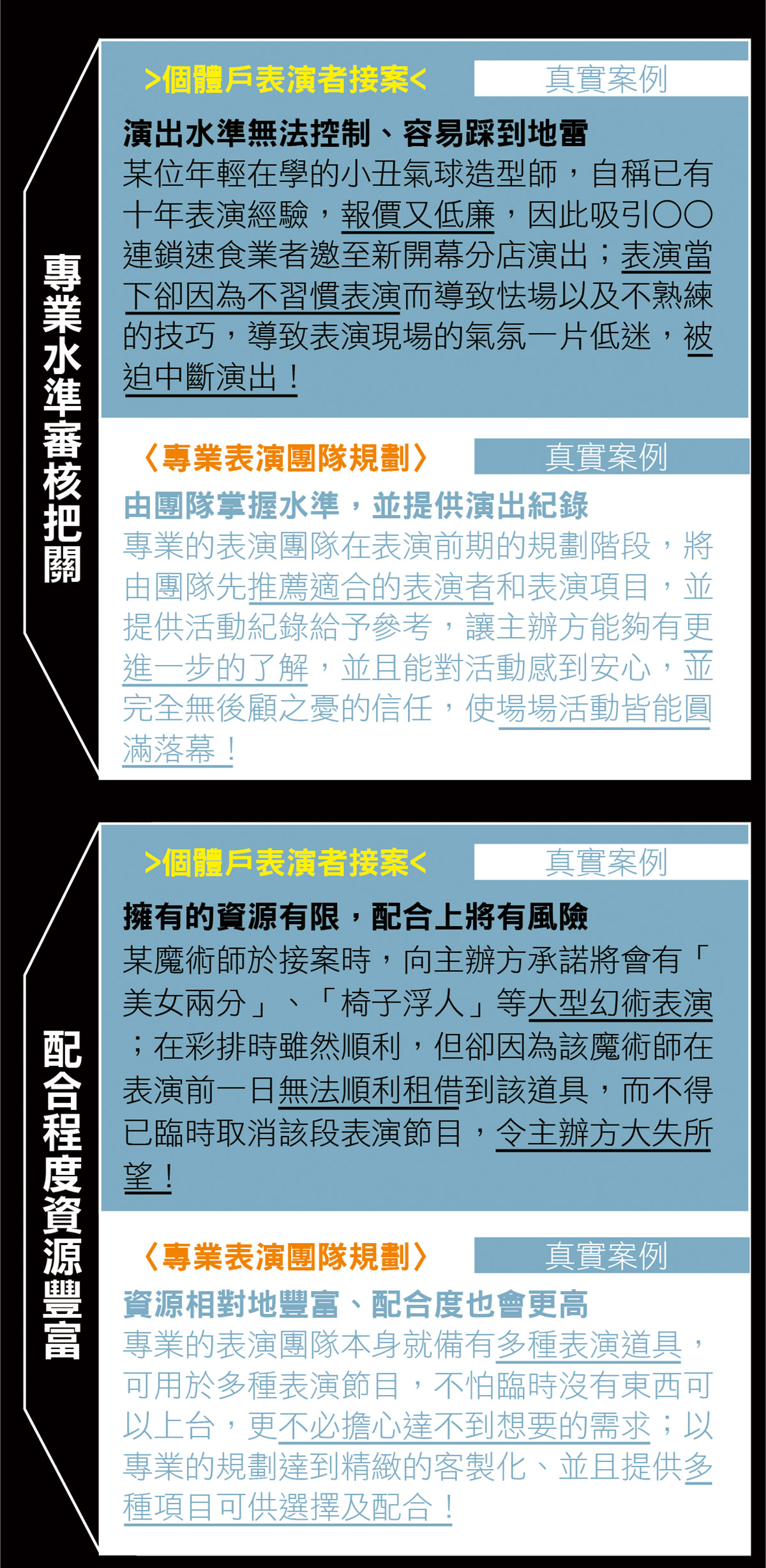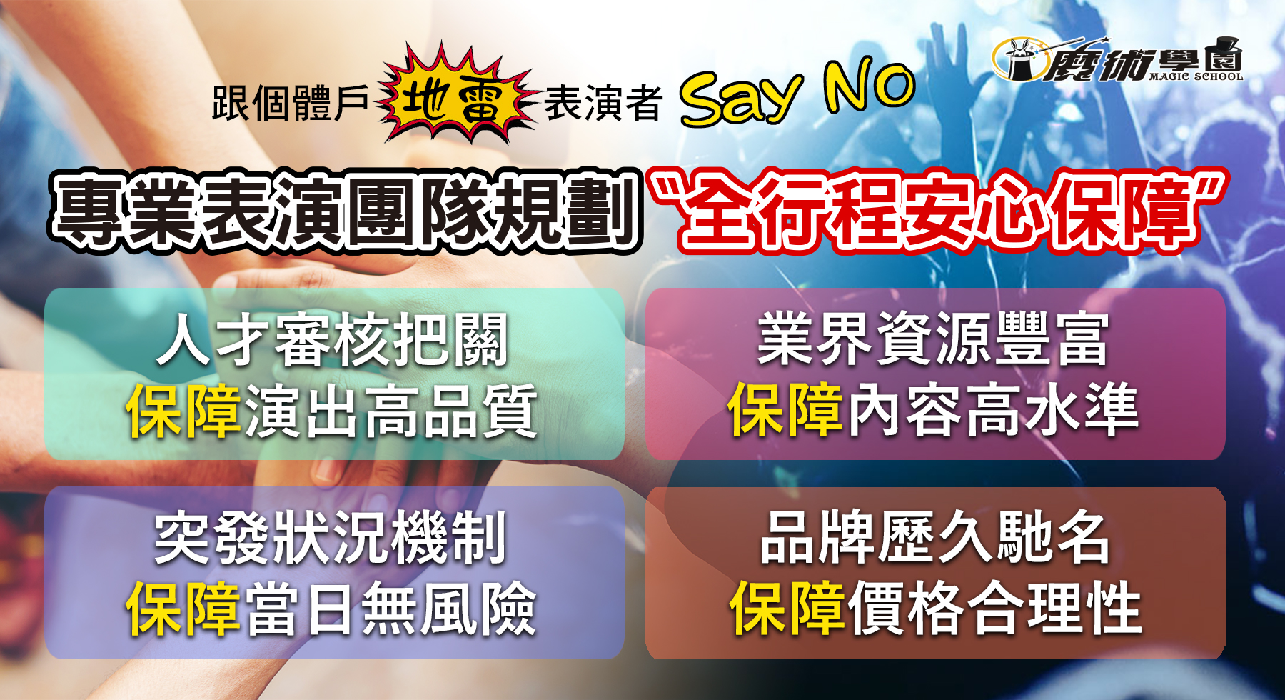 創作藝術與商業性兼具的獨特表演,擅長把客戶要傳遞的理念用魔術方式重新包裝後,運用在各種活動場合,創造出獨一無二並符合主題的魔術行銷。