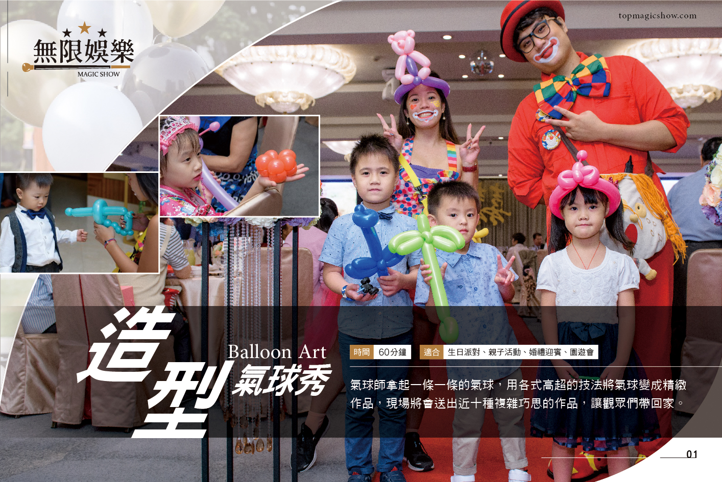 小丑總是在各個場合中最歡樂的人,不止會變魔術、更會折許許多的造型氣球。不止是表演、更是跟所有台下小朋友們一起互動競賽,讓所有小朋友沈浸在歡樂的氣氛當中,小丑絕對是孩子們最佳玩伴!